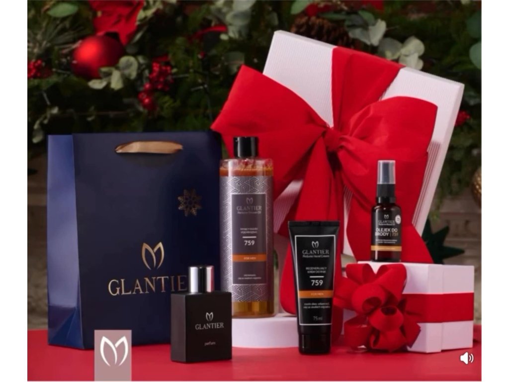 Sada pánskej kozmetiky Glantier 759 Exclusive sa skvele hodí ako vianočný darček. Exkluzívna drevito-korenistá vôňa Glantier Prémium Parfum 759 spôsobí, že váš muž pocíti energizujúcu dávku osvieženia. Unikátna sada parfumovanej kozmetiky, ktorej súčasťou je Premium Parfum 759 s vysokým obsahom vonných olejov (až 22%), uzavretá v exkluzívnej fľaštičke, pánsky krém na ruky 759, ktorý účinne hydratuje a regeneruje pokožku rúk, olej na bradu 759 a náš najpredávanejší sprchový olej 759, balené v elegantnej veľkej sivej darčekovej taške Glantier.